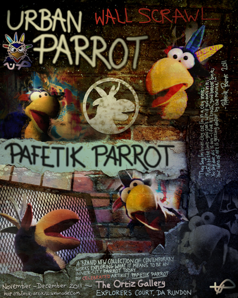 Pafetik Parrot seeks to both delight and confuse audiences by merging the ostentatious with the pretentious. His work embraces many different styles of claptrap, being fashioned in an unusual combination of materials ranging from the inane to the mundane. His unique style exploits the collision of cultures prevalent in modern urban life, revelling in the rich textures and timeless expressions of the social justification of all things pointless.